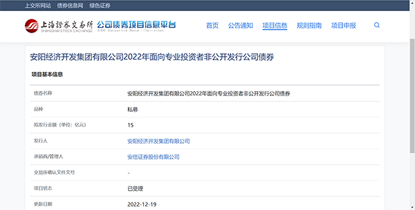 12月16日,集團(tuán)收到上海證券交易所通知,集團(tuán)報(bào)送的非公開(kāi)發(fā)行公司債券并掛牌轉(zhuǎn)讓的申請(qǐng),上交所按照相關(guān)規(guī)定已予受理。本期債券名稱(chēng)為安陽(yáng)經(jīng)濟(jì)開(kāi)發(fā)集團(tuán)有限公司2022年面向?qū)I(yè)投資者非公開(kāi)發(fā)行公司債券,品種為私募債,金額15億元,承銷(xiāo)商/管理人為安信證券。