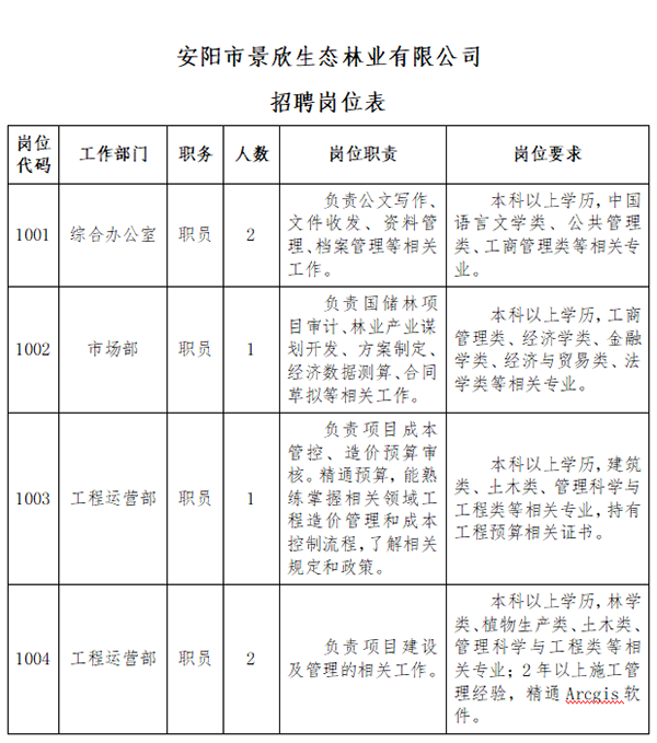 安陽市景欣生態(tài)林業(yè)有限公司(以下簡稱“景欣林業(yè)”)是安陽市國家儲備林建設PPP項目公司,根據工作發(fā)展需要,擬委托安陽鼎泰勞務派遣有限責任公司(以下簡稱“鼎泰公司”)面向社會公開招聘6名工作人員?,F將有關事項公告如下: