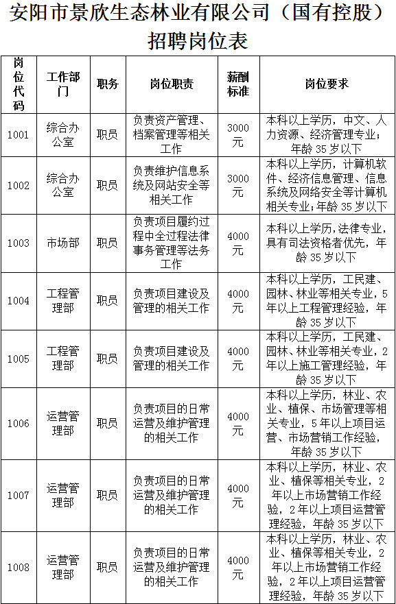 根據(jù)工作發(fā)展需要,現(xiàn)委托安陽鼎泰勞務(wù)派遣有限責(zé)任公司面向社會公開招聘8名員工,派遣至安陽市景欣生態(tài)林業(yè)有限公司工作?,F(xiàn)將有關(guān)事項公告如下: