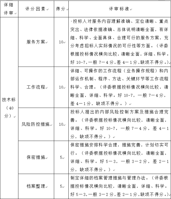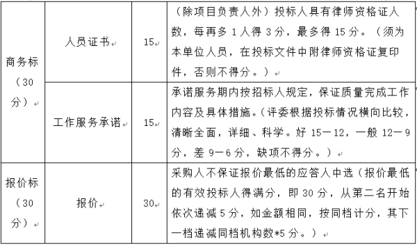 本次采購擬采用綜合評分法。綜合評價(jià)指標(biāo)體系,包括技術(shù)指標(biāo)(40%)、商務(wù)指標(biāo)(30%)、報(bào)價(jià)(30%)。排名前2的應(yīng)答人入圍,具體評分標(biāo)準(zhǔn)如下:
