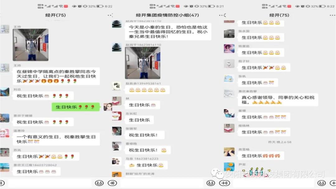 1月25日,是經(jīng)開集團(tuán)志愿者秦勝攀34歲的生日。在晝錦中學(xué)隔離點(diǎn),他向往常一樣重復(fù)著為隔離人員配送生活物資、清理垃圾、環(huán)境消殺等工作。下班后在宿舍出現(xiàn)了暖心的一幕:在這個特殊的時期、特殊的地方、特殊的環(huán)境,沒有蠟燭、沒有蛋糕,但有特殊的“家人”陪他一起過生日?!凹胰恕眰兗娂姳硎緪坌模蜕狭藴嘏淖8?。